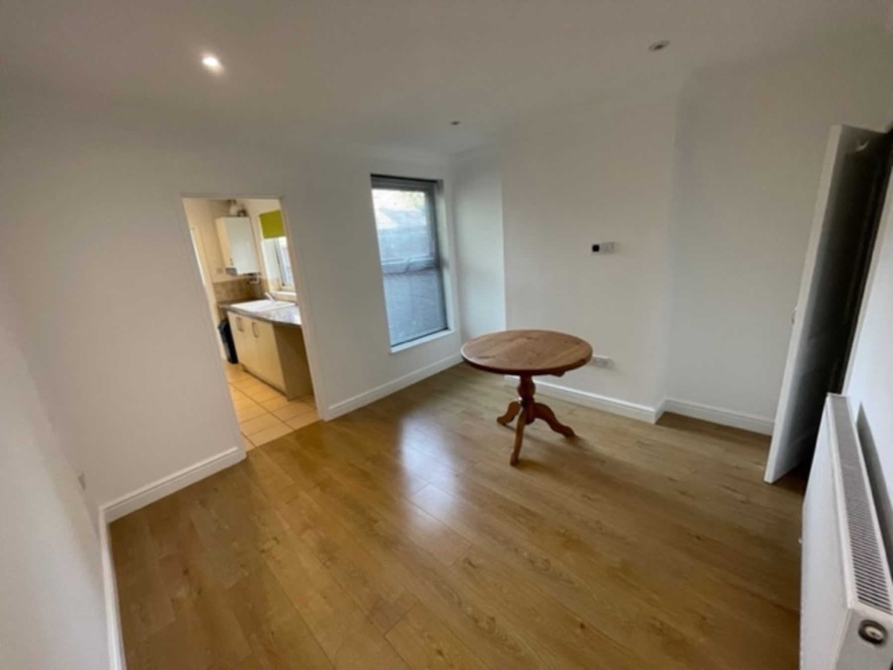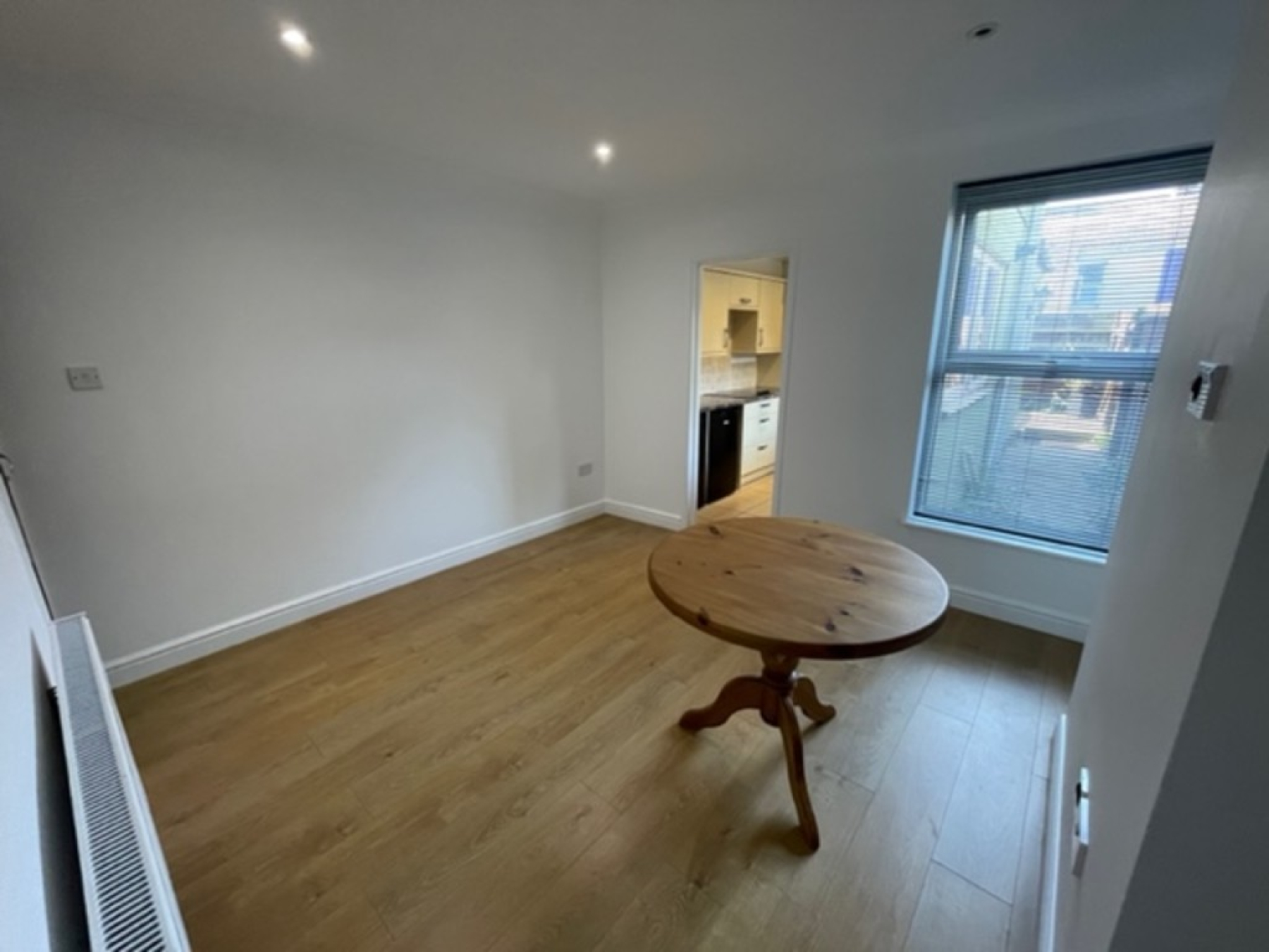 Bright dining area leading into a modern fitted kitchen complete with cooker